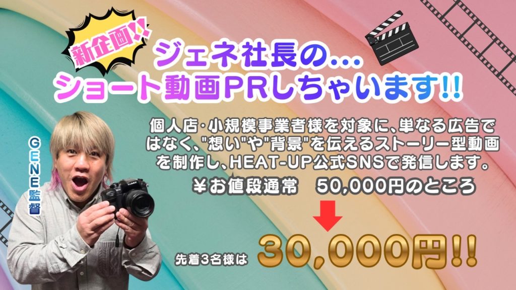 単なる広告動画ではなく、あなたの”想い”や”背景”などのを含めた動画を作成して、HEAT-UP公式SNSで発信します。